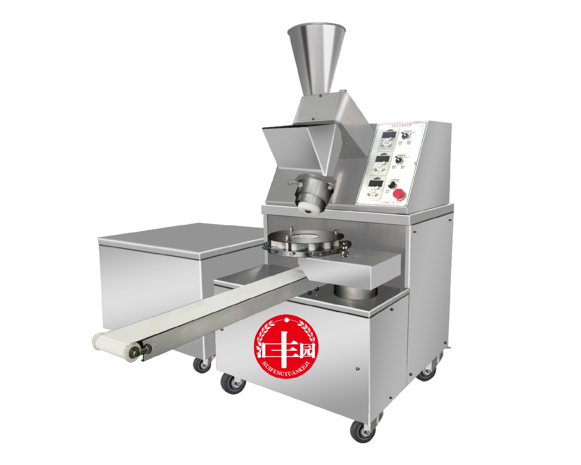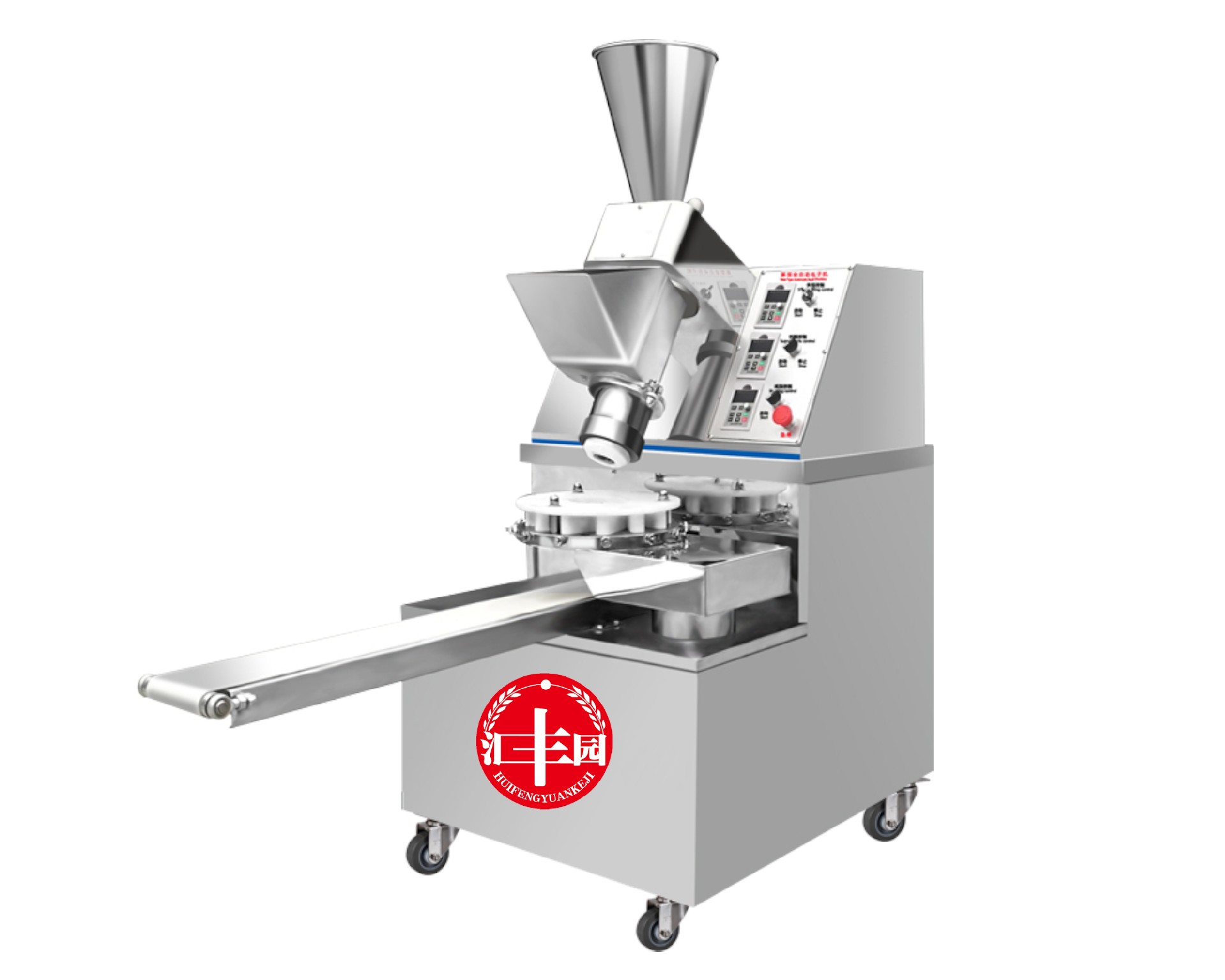 多功能包子機采用螺旋式推面方式,由模具控制面皮的厚薄。面斗中的面由供面調系統,將面送至機頭出口處,形成含餡的面柱后由成型盤內的成型塊將面柱擠斷成大小均勻的包子。全機的工作部分主要由:送面系統、送餡系統、機頭、成型盤、輸送帶五部分組成。工作流程:供餡料斗-〉供面斗)-〉加餡加面-〉切斷成型-〉傳送帶-〉醒發-〉蒸制;優勢:采用雙絞龍,螺旋揉面推進出面,大螺徑,緩慢勻速出面,面皮受力小,供面速度可調。餡管采用半臥式或立式餡斗裝置,立式有利于改大顆粒餡料的流通,在制作較稀餡料時可采用半臥式餡斗下均勻。 可加配值可生產:餡餅和方型饅頭、圓饅頭等。成型盤采用軸承傳送,配合刀塊張合防止以前包子機做大包子成型堵面現象。有9褶或12褶和16褶花型供用戶選擇,進口高分子材料刀塊利用科學原理均衡受力減小,解決了其它包子機成型刀塊靠一塊主刀推動其它副刀運動易磨損,刀夾面粘面,易受天氣變化而熱脹冷縮不能正常生產的難題,促進機器穩定延長使用壽命。免費培訓包子制作技術、及速凍生胚技術;